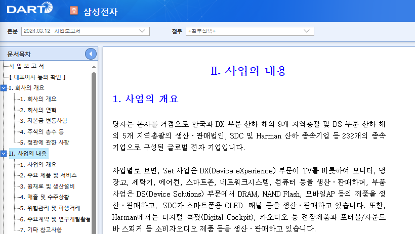- 전자공시시스템(DART)에 공시된 분반기 보고서 및 사업보고서 상 사업의 내용을 참고해서 사업의 개요, 주요 제품 및 서비스, 원재료 및 생산설비, 매출 및 수주상황, 주요 계약 및 연구개발활동 등을 구체적으로 파악할 수 있습니다. 이는 숫자로서 과거의 성장 및 미래의 성장 가능성에 대해 판단할 수 있는 비교적 객관적인 데이터라고 볼 수 있습니다.